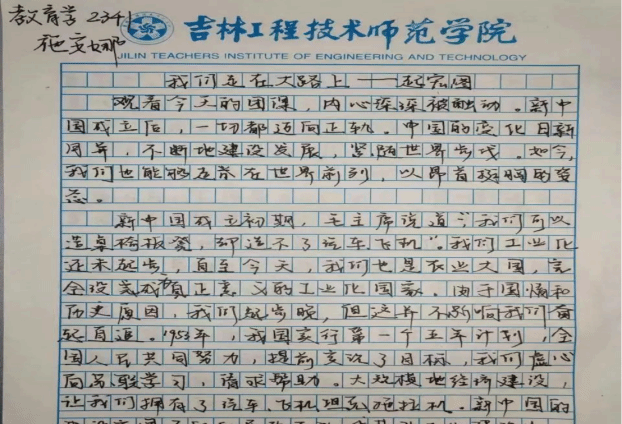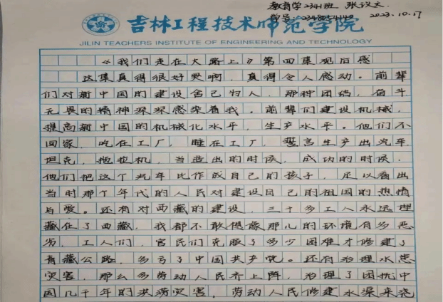 我们走在大路上,披荆斩棘向前行。我们现在的辛福生活都是革命先辈抛头颅、洒热血换来的。目前我国正处于高质量发展阶段,作为新时代青年,我们要向革命先辈好好学习,努力拓展知识面,不断提高综合素质,解放思想,创新发展,不忘党的谆谆教诲,热爱国家和人民,坚定理想信念,增强责任感和使命感,为中华之崛起而不懈奋斗。