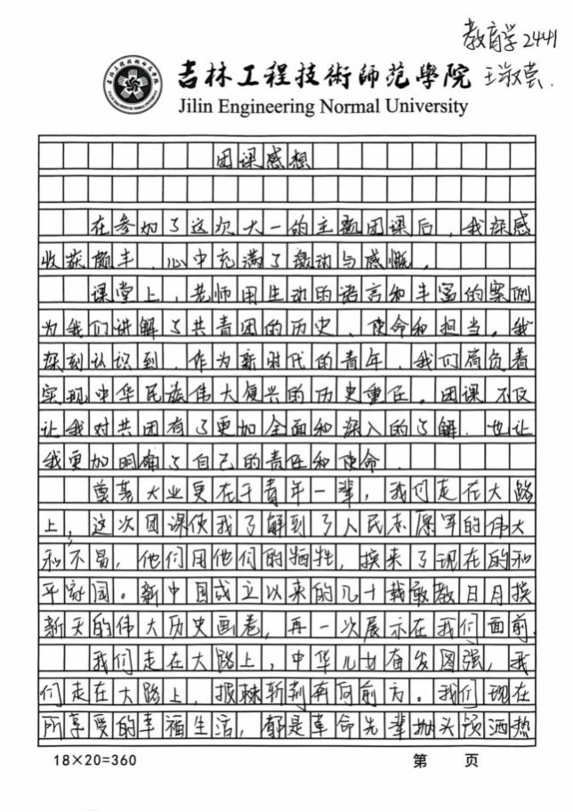 奠基大业更在于青年一辈,我们走在大路上,这次团课使我了解到了人民志愿军的伟大和不易,他们用牺牲换来了现在的和平家园。新中国成立以来的几十载敢教日月换新天的伟大历史画卷,再次展示在我们面前。