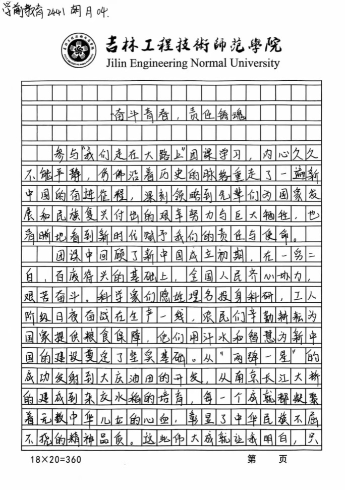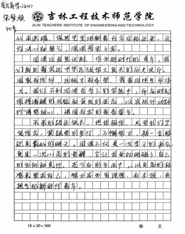 未来的路还很长,但我相信,只要我们坚定信念,紧跟党的步伐,不懈努力,就一定能迎来最好的明天。团课不仅是一次学习的机会,更是一次心灵的觉醒,它让我更加明确了自己的方向和责任。在今后的生活中,以更高的标准来要求自己,努力成为有理想,有本领,有担当的新时代青年。