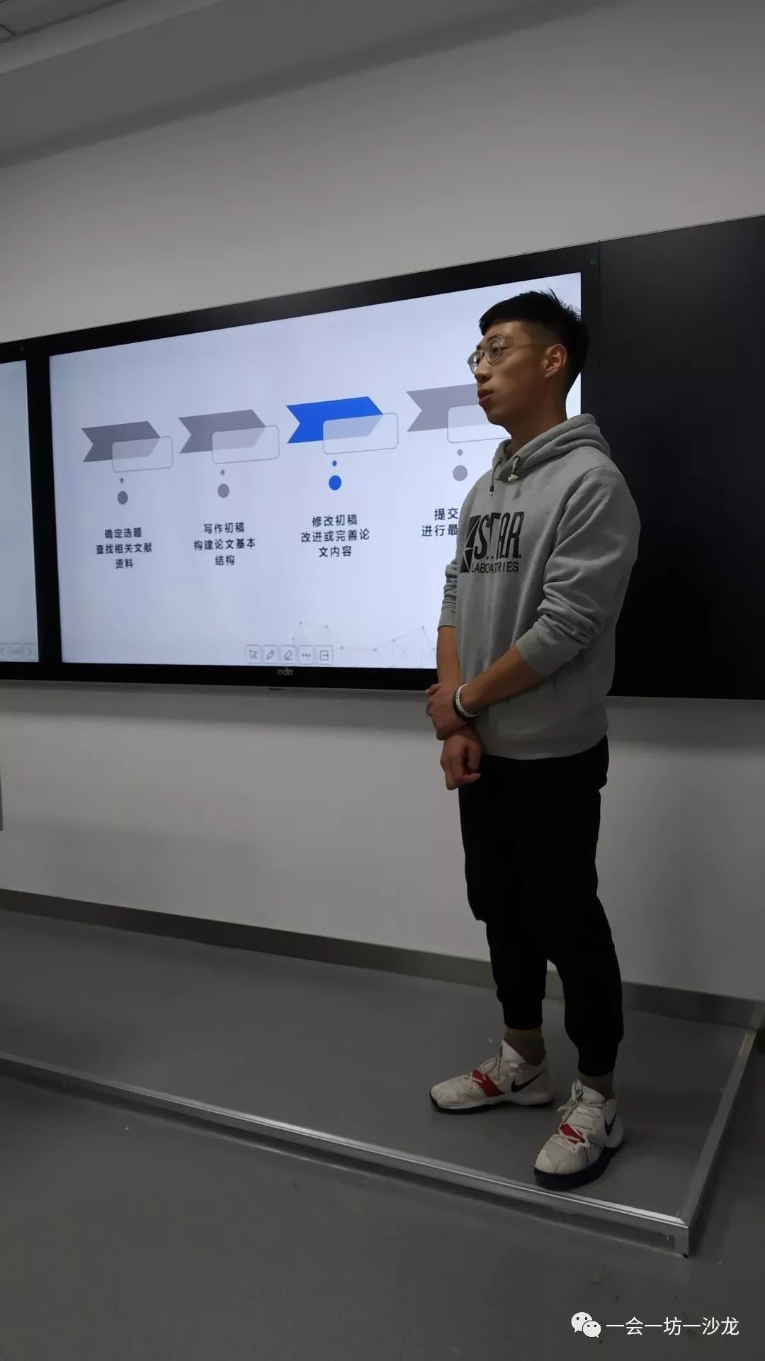 听了学长和老师的讲解,心中对论文有了一个大有的框架,了解了写一篇论文需要大量时间来找支撑材料和将--系列相关文章反复斟酌。它和作文在长度和内容方面有很大不同,论文论述可以是-一个社会热点,也可以是普通的一个生活现象,但是更多需要加入我们自己的想法。在看了学长的PPT演示之后,我意识到了论文其中的智慧,产生了浓厚兴趣,希望以后能在沙龙中得到更好的历练,学习学术知识,打好论文基础。