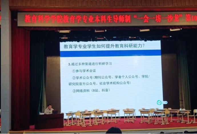 教育学专业优秀毕业生代表陈浩捷(教育学1741班员工、沈阳师范大学硕士研究生、拟录取辽宁大学高等教育研究所2024级博士研究生)做题为《本科生参与导师教科研工作面面观——基于个人经验的探讨》的交流报告。陈浩捷学长回忆了本科期间参加“一会一坊一沙龙”活动的心理路程,并结合近几年的专业学习与发展,针对学弟学妹提升教育科研能力提出几点建议:一是开展广泛大量的科研阅读,二是以深度参与导师教科研活动,三是通过参加学术会议、关注学术公众号、查阅网络资料等多种渠道进行科研学习。